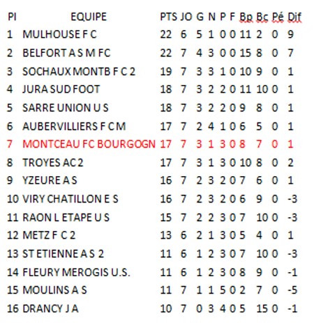 Avertis à Montceau : Berthaud (15ème)Couturier (61), Portejoie (65ème), Belhow (70ème), à Jura Sud ; Carlos Miranda (66ème).