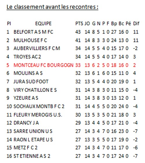 L’AS Moulins est actuellement 6ème au classement de ce groupe avec 1 seul point de retard sur le FCMB qui est, lui, classé juste devant, à la 5ème place. C’est dire combien la tâche des Montcelliens ne sera pas aisée, surtout après cette longue période d’inactivité et surtout la montée en puissance que montre l’équipe de l’Allier depuis plusieurs matchs..