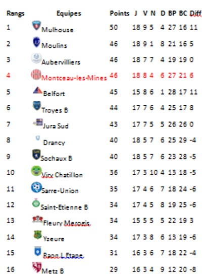 Les résultats de la 19ème journée (manquent les résultats de FC Metz – ASM FC Belfoert et de US Fleury Mérogis – ES Viry Châtillon qui se jouent aujourd’hui :