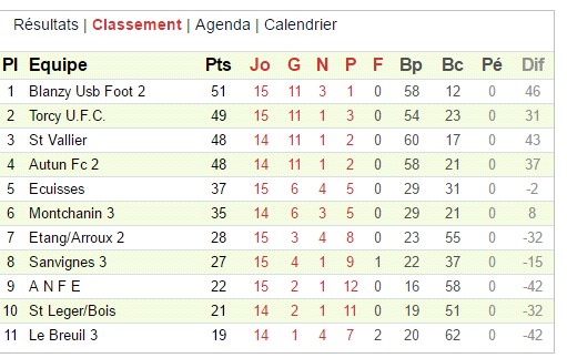Blanzy s’impose à Écuisses et prend donc la tête du classement (Voir Article US Blanzy) tout en ayant (comme Torcy) un match en plus que Saint Vallier et Autun B. La montée est en bonne voie.