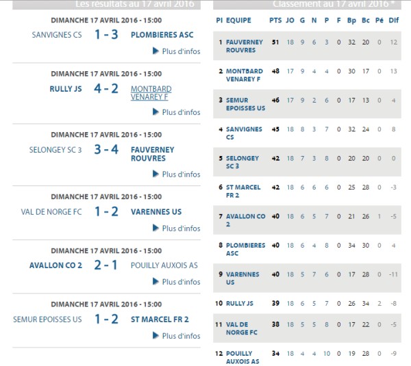 Retour sur les matchs du week-end de nos représentants, à savoir Montchanin à domicile qui s’impose face à Genlis (2-1), Sanvignes surpris à domicile par Plombières (1-3) et Palinges battu, cela s’est joué à pas grand chose, dans le Derby l’opposant à la Réserve du FC Gueugnon (1-2). Retrouvez cette année, une couverture très large des équipes du District du Pays Minier sur Montceau News, revivez avec nous les exploits de vos équipes favorites. Nouvel épisode avec les matchs de promotion de Ligue de ce dimanche 17 Avril, décryptage complet :