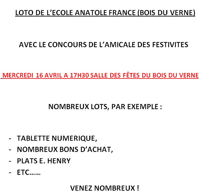 Loto, le mercredi 16 avril 2014, avec le concours de l'Amicale des Festivités